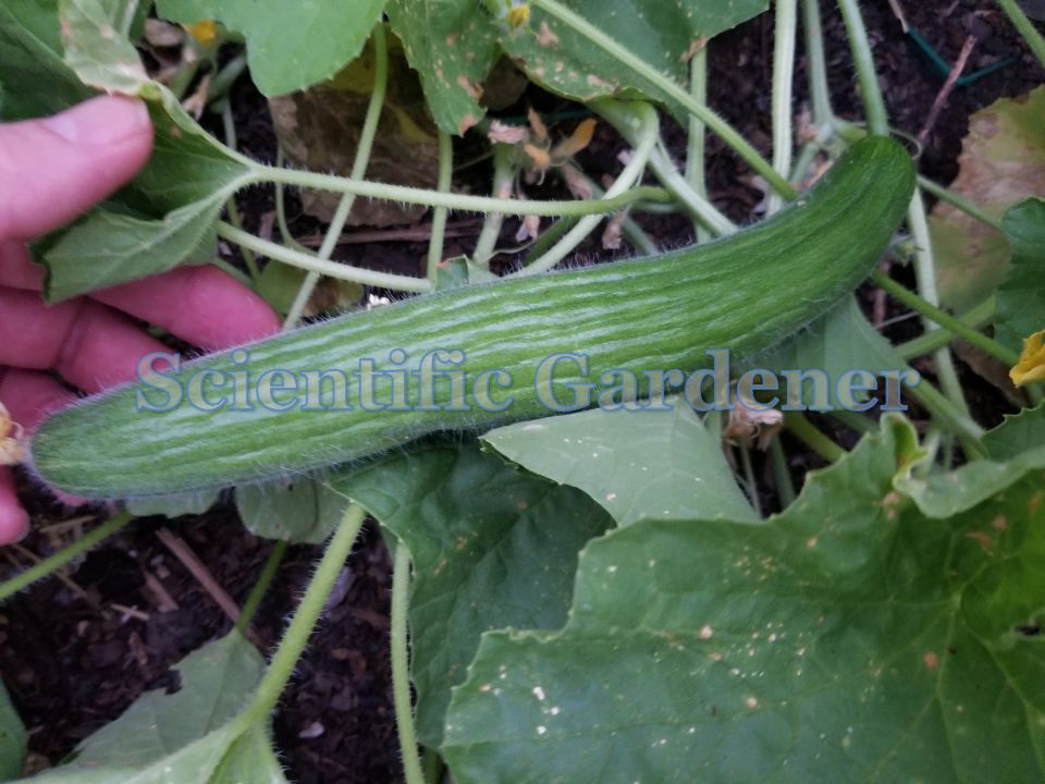 One thing I really like about growing out delicious cucumbers is that even when things don’t work out, that’s okay. Despite how nice it would be to have everything work out the first time, the challenge of having to select out traits is interesting and eating the food that doesn’t make the cut is even better. So when the first vines began producing dark female fruit, I was able to determine what vines were destined to become seed and which were going into my next salad, just by looking at their length. Once the smaller fruits had become large enough to eat, I could trace their vines back to the root and remove them from the garden to eliminate their male flowers from the population and make room for the preferred vines that would produce the more desirable fruit.